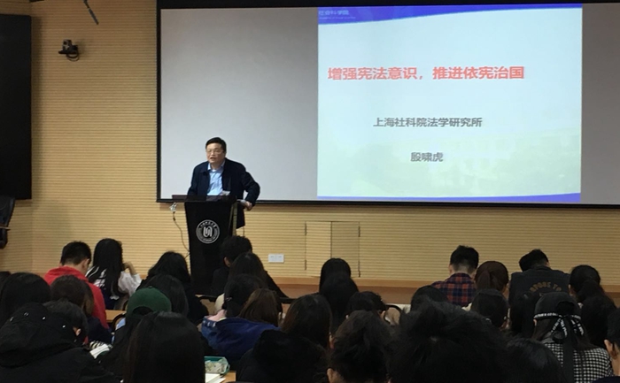 3月29日,习近平新时代中国特色社会主义思想进思政课——“闻道中国”思政课系列讲座之二在奉贤校区第二教学大楼102讲堂举行。本次讲座特邀著名法学家、上海社会科学院法学研究所副所长殷啸虎教授作了题为《深入学习宪法 增强宪法意识》的专题讲座。讲座由上海师范大学马克思主义学院教授、博士生导师周中之教授主持,马克思主义学院“思想道德修养与法律基础”任课教师苏令银、马晶钰,以及来自人文、教育、哲法、商、旅游、外语、建工、信机等12个学院近200名选修“思想道德修养与法律基础”课的学生聆听了讲座。