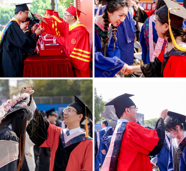 骊歌唱响,拨穗礼成。台上台下19个学院,12个方阵的260余名各学院教师代表为毕业生正冠拨穗。