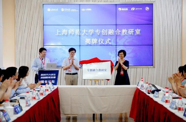 三位嘉宾致辞后,举行了上海师范大学专创融合教研室的揭牌仪式。上海师范大学教务处处长高湘萍教授和上海师范大学专创融合教研室主任、上海师范大学全球创新资本研究院执行院长张玉华教授共同为上海师范大学专创融合教研室揭牌。