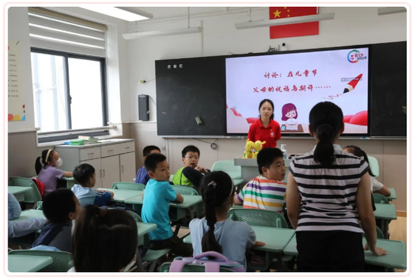 “今年‘六一’国际儿童节到来之际,习近平爷爷给你们送来了美好的祝福和殷切期盼:新时代中国儿童应该是有志向、有梦想,爱学习、爱劳动,懂感恩、懂友善,敢创新、敢奋斗,德智体美劳全面发展的好儿童。其实这是对大家的四种期望,请同学们分一下是哪四种期望。”徐汇区虹梅街道办班点设在漕河泾新兴技术开发区实验小学,二楼教室里,上海师范大学志愿者倪楠楠为孩子们带来开班第一课。