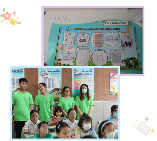 走进徐汇区虹梅街道爱心暑托班,一楼走廊里张贴了暑托班公示栏,包含了教师介绍、志愿者介绍、本周活动安排、本周菜单等,点位巡查人员和安全紧急通讯录也张贴公示。