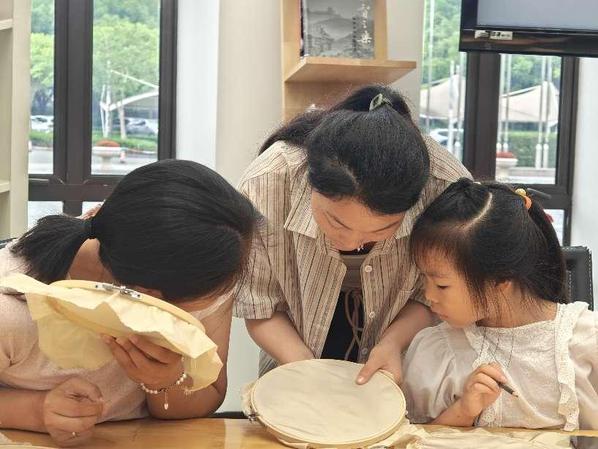 7月9日,在宝山国际民间艺术博览馆“非遗传承实践课堂”现场,来自宝山的居民们在认真学习顾绣技艺