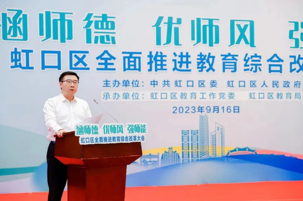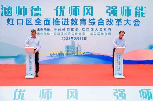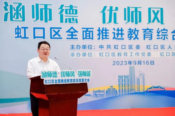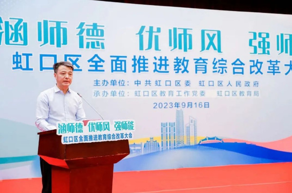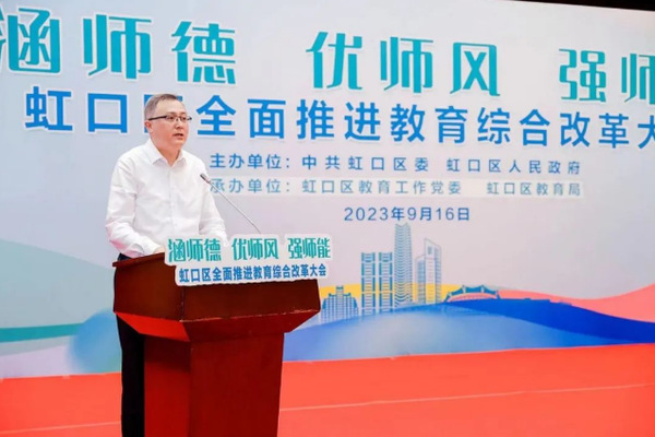 虹口区委书记李谦在大会上指出,虹口要夯实教育之基,强化高素质教师队伍建设。加大引育力度,优化师资配置,提升虹口对教育人才的吸引力,完善培育机制,在“打造名师共同体”上持续用力,在“打造后备人才蓄水池”上持续用力,为虹口教育可持续发展筑牢坚实基础。要抓好师德师风建设,引导教师争当“四有”好老师,打造师德师风建设高地。要统筹区域资源,优化发展布局。加快重点教育项目建设,深化合作办学,扩大优质基础教育资源覆盖面,促进优质教育均衡发展。要进一步擦亮虹口思政教育品牌,发挥“文化三地”资源优势,深化交流合作,多措并举深入推进“大思政课”建设,实现全员全程全方位育人。