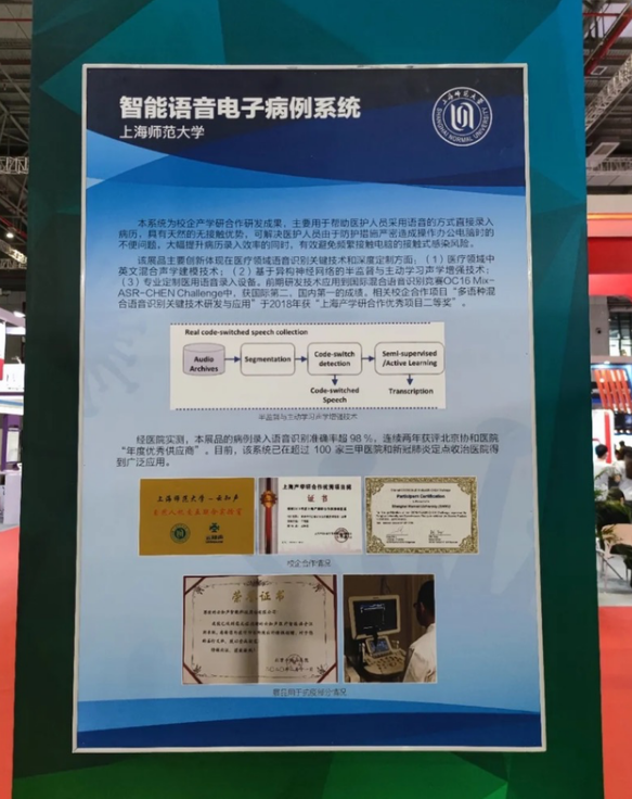 经医院实测,本展品的病例录入语音识别准确率超 98 %,连续两年获评北京协和医院“年度优秀供应商”。目前,该系统已在超过 100 家三甲医院和新冠肺炎定点收治医院得到广泛应用。