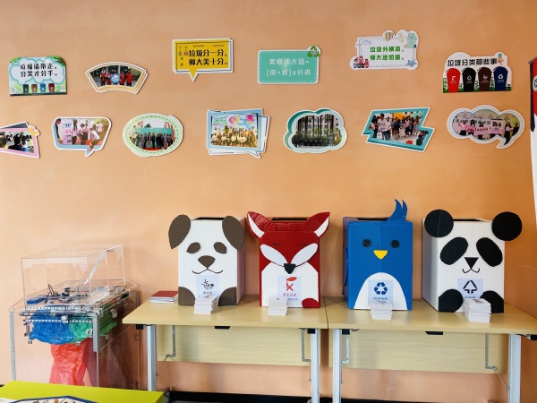 上海师范大学垃圾分类体验馆:小学教育专业和学前教育专业的同学结合专业特色制作的创意卡通垃圾分类桶。