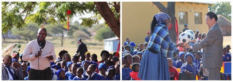 活动一开始,全场起立奏唱两国国歌。随后外方院长帕特•穆嘎达发表致辞。他从自身学习汉语的体会和如今中国在非洲、在世界上的影响力表达了对中华文化的热爱与肯定,勉励博茨瓦纳孩子积极学习汉语。随后,中方院长蒲度戎代表孔子学院向主办学校赠送典藏版书籍《CHINA》、足球、文化衫等礼物。
