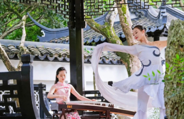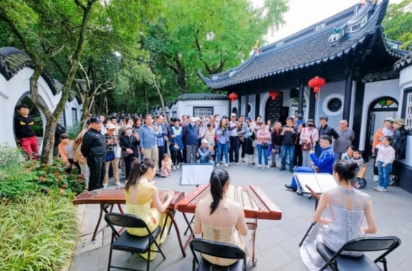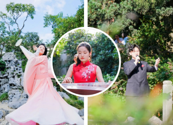 沉浸式音舞诗画表演由上海师大音乐学院艺术团呈现。演出将江南丝竹、江南民歌、民族舞蹈等多种艺术形式完美融合,以江南园林独特的亭台楼阁、长廊桥梁为舞台,带领观众在柔美典雅的舞姿、悠扬动人的乐声、婉转秀丽的江南小调中,感受曲艺江南的魅力。精彩的演出、新颖的形式,迅速吸引游客们扶老携幼流连于节目之间。