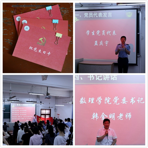 活动由数理学院党委副书记蔡琼霞老师主持。学生党员孟庆宇同学讲述了自己在四年中从入党、从军到回校读书的心路历程。对于每一位同学来说,获批入党的日子是非常有纪念意义的,活动中,学院贴心的为每一位毕业生党员赠送了红色生日卡,同学们收到后非常欣喜。之后,在王敏如老师慷慨激昂的领誓下,全体党员起立并重温入党誓词。数理学院党委书记韩金明在党员同学们离校之际也诚挚的送上美好祝福与叮咛,他希望全体毕业生党员一要牢记党员身份、切实发挥好党员的先锋模范作用;二要加强党性修养全面提升自己的政治理论素养和专业知识水平;三要保持积极进取的精神,不断学习,适应时代要求。最后,他也代表学院祝福同学们工作顺利,事业有成,美满幸福。