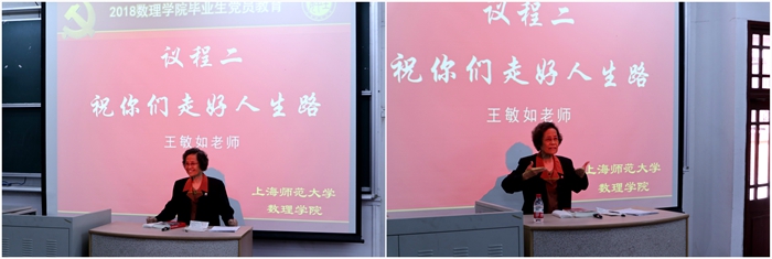 5月23日下午,在徐汇校区第一教学楼109教室,数理学院党委举行了主题为“牢记时代使命书写人生华章的2018届全体毕业生党员教育活动。全国优秀党务工作者、我校王敏如老师和数理学院党委相关负责人以及110名2018年应届毕业的研究生、本科生学生党员参加了活动。