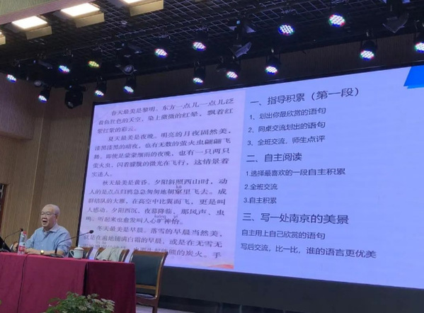 在吴忠豪看来,教师应避免碎片化的解读文本,更应注重指导学生积累和自主阅读,把话筒交给孩子,让他们找出自己最欣赏的词句、相互交流,再自主积累,用上自己积累的语句写一写自己眼中的美景,比比谁的语言更优美。