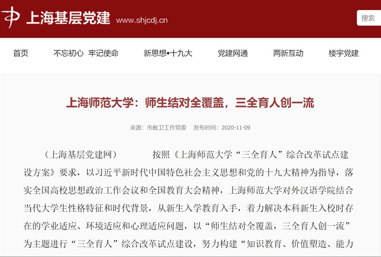 近日,上海基层党建网以“上海师范大学:师生结对全覆盖,三全育人创一流”为题,报道了我校对外汉语学院在“三全育人”综合改革试点建设的有效探索。