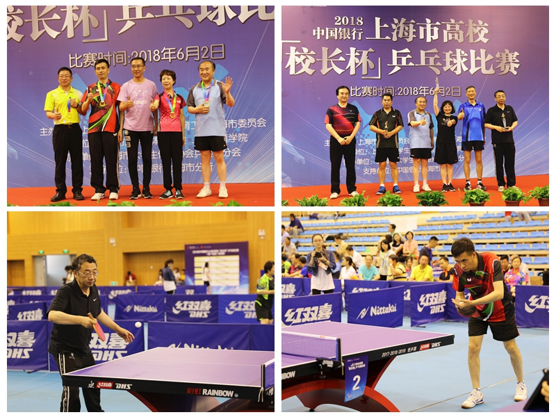6月2日,由上海市教委、上海市教育工会主办、上海大学生体育协会和上海体育学院承办的2018年中国银行上海市高校“校长杯”乒乓球比赛在上海体育学院中乒院训练馆举行。我校代表队由党委书记滕建勇、校长朱自强、党委副书记裴小倩、副校长张峥嵘等组成,经过努力拼搏,最终在17支高校参赛队中荣获季军,滕建勇书记连续第五年荣获个人“全胜奖”。