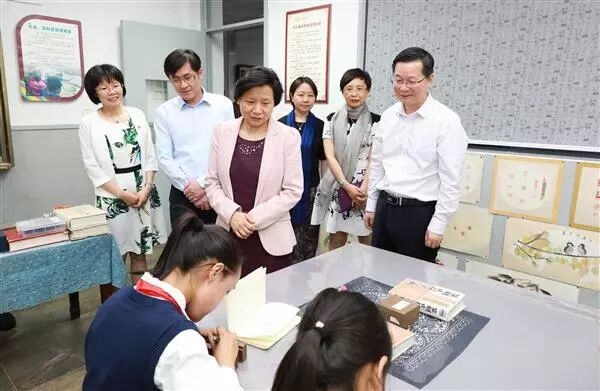 ▲市教卫工作党委书记虞丽娟前往方泰小学调研纂刻文化传承工作。