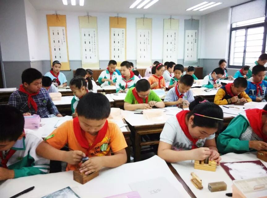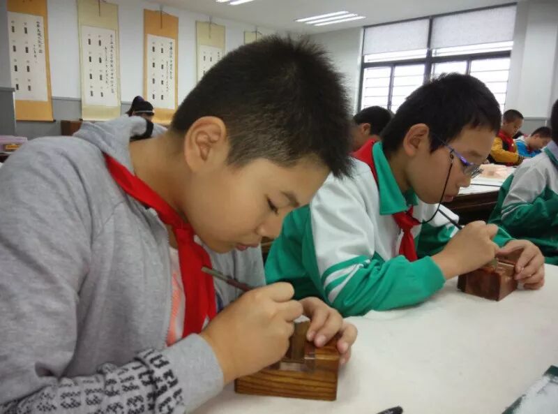 近年来,篆刻艺术作为弘扬和传承中华民族传统文化的有效途径,得到越来越多基层学校的重视,打造了以篆刻为特色的校园文化。如嘉定区方泰小学经过十年的实践和发展,全校师生“人人会拿篆刻刀,个个金石显创意”,篆刻作品多次在国家级、市级比赛中获奖,被评为全国书法实验学校,还把“弟子规”编入校本教材中,实现中国的传统美德教育与篆刻文化的紧密结合。
