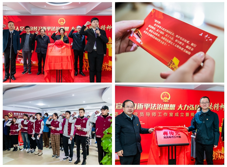 揭牌仪式之前举行了宪法宣誓仪式。全体与会成员在领誓人领诵誓词下,举起右手共同进行宪法宣誓。哲学与法政学院党委副书记、副院长姚秋磊介绍了蒋传光党员导师工作室成立的背景和工作内容。哲学与法政学院院长蒋传光教授与康健街道党工委书记池龙共同为工作室揭牌,上海市创言律师事务所主任余爱国为工作室成立致贺辞,徐汇区司法局党委书记、局长左静鸣作领导讲话。