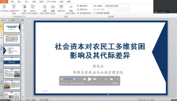 基于2018年中国家庭追踪调查数据,华侨大学汤兆云教授阐述了农民工相对贫困的现状及分布情况,并对社会资本对农民工相对贫困的影响和代际差异进行了深入探讨。他表示,依据相关调研结果来看,目前约三分之一的农民工有陷入相对贫困状态的风险,但不存在严重的极端贫困问题;与新生代农民工相比,老一代农民工相对贫困状态较为严重,且表现在教育和健康贫困指标上更为明显;社会资本能够降低农民工陷入相对贫困状态的可能,其中社会声望能够显著降低农民工相对贫困的程度。这一调研结果经过稳健性检验后依旧成立,通过费舍尔组合检验法进行组间系数差异检验,分析发现社会声望对老一代农民工相对贫困的影响程度更高。他期待这一研究能重新审视社会资本对农民工摆脱相对贫困的作用,为“后扶贫时代”农民工增收工作的有效开展提供实证依据。