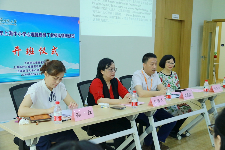 6月25日上午,2018中小学心理骨干教师高端研修班开班仪式在我校徐汇校区香樟苑201室举行。上海市教委德育处副处长江伟鸣,上海学生德育发展中心副主任孙红,台湾屏东大学教育心理与辅导学系张莉莉副教授出席,我校学生工作部(处)部长朱惠军主持,来自16个区推荐的健康教育骨干教师成为本届高研班学员。