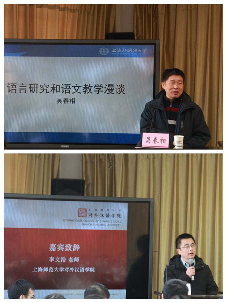 对外汉语学院副院长李文浩致开幕辞,对到会的优秀校友表示热烈的欢迎并回顾了上海师范大学语言学学科发展历史,同时希望同学们在学术交流中能够创新学术思维、开拓研究视野、激发学术兴趣,继续发扬上海师范大学语言学研究的优良传统,立意高远、勤学乐学。对外汉语学院杰出校友吴春相教授结合自身的教学经验为同学们做了题为《语言研究和语文教学漫谈》的学术报告,在解读过程中提出当前年轻学生在语言表达方面存在的问题,表示语言研究不仅要为科学合理地解读语文教材中的语言服务,还要为如何进行正确的、更好的语言表达服务。