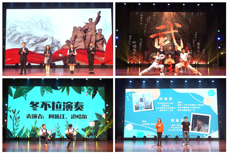 师大学子们在迎新晚会的舞台上展现青春魅力,追逐美好梦想。校啦啦操队的《China girl》用悦动的舞步跳出了的朝气蓬勃的峥嵘气象。进博会“小叶子”代表郭杨云娇以《奉献青春力量,铸就青春回忆》为题,深情的演讲彰显了师大人有能力、有担当、有作为的青春形象。由师大退伍兵带来的《迷彩青春》诠释了青年一代保家卫国、不畏艰险的满腔热血和优良品质。楼兰剧社自编自导的心理剧《路灯下》引领我们走进当代大学生的内心世界,守护心理健康,为广大学生的光明人生保驾护航。音乐学院的同学轻拨琴弦,婉转动人的歌喉唱响了《你给我听好》,将所学与所想结合,扬起梦想之帆,在青春路途上不断奋楫前行。