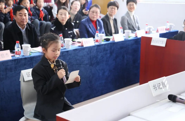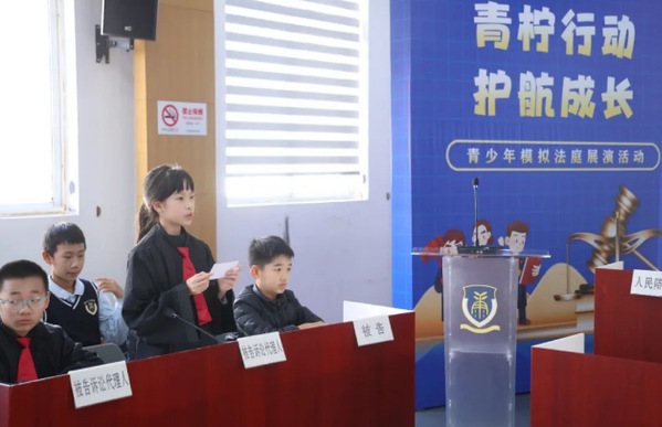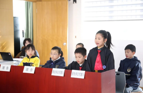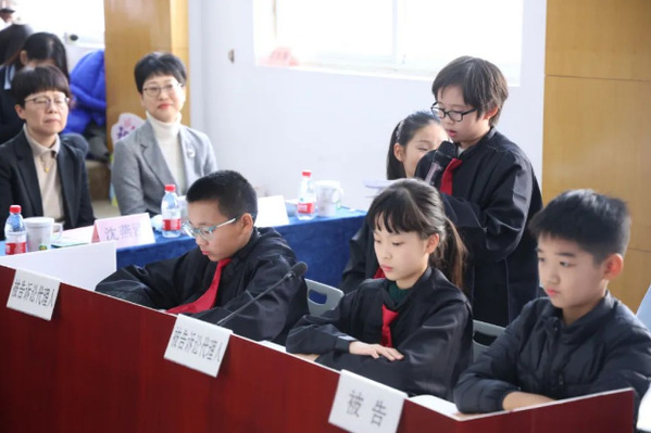 上海师大哲学与法政学院法学社模拟法庭团的研究生来到康健外国语实验小学,带领小学生们学习剧本、理解法条、演绎庭审现场。小学生们扮演法官组、原告组、被告组和证人组,展现了一次生动还原的法庭“审判”现场展演。