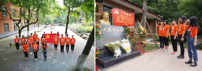 “无论是严谨求实、协作攻关、潜心研究、默默无闻的科研精神,还是自力更生、艰苦奋斗、大力协同、勇于攀登的‘两弹一星’精神,都令我们无比倾佩。当今的我们更是要秉承着这样的时代精神,牢记革命先辈的努力奋斗,发挥我们的创新创业精神,谱写新中国伟大复兴的新篇章……”同学们深有感触。恰逢建党九十六周年纪念日,“小橙子”们在绵阳向七一献礼。团队中的党员同学们在邓稼先故居塑像前,高举右手宣誓,重温入党誓词,时刻提醒自己不忘初心,始终铭记党员使命。