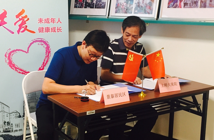 7月6日下午,伴随着酷暑高温,我校美术学院党总支与斜土街道景泰社区党总支联建签约仪式在景泰社区“亲邻党建服务站”举行,同时开展了首次共建活动。上海师范大学美术学院党总支、斜土街道景泰社区党总支、景泰社区居民代表及美术学院优秀学生党员代表参加了此次活动。