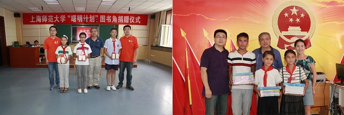 在上海韩哲一教育扶贫基金会和上海师范大学教育基金会的支持下,“三下乡”团队来到吐鲁番市高昌区亚尔镇社区学校的“红领巾”爱心课堂,为当地的少数民族贫困学生捐赠爱心图书和文具,同时也参与了爱心课堂的教学,实践团成员集体教授少数民族学生民歌《茉莉花》,深受学生的喜爱。7月11日下午,在新疆生产建设兵团团委、八师石河子市团委的支持下,上海韩哲一教育扶贫基金会、上海师范大学教育发展基金会和上海师范大学团委共同为石河子第五小学、第四中学、143团第三中学捐赠“曙明计划”图书角。捐赠仪式结束后,实践团成员们还给孩子们带去了“爱心学校”义教活动,通过生动、活泼的历史短剧再现张骞出使西域的过程,在互动和问答中让在场的学员们对丝绸之路有了更深的认识和理解。