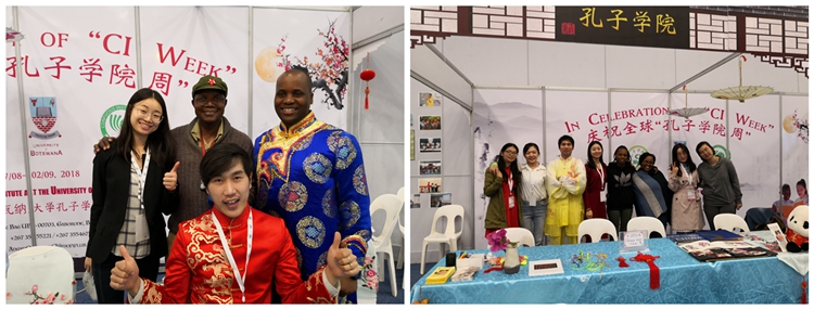 博茨瓦纳大学孔子学院的展台是徽派建筑的屋檐配以大红灯笼和其它有特色的中国文化元素,在众多展位中显得格外引人注目。一周的时间里,孔子学院向观众展示了汉语公开课、武术、书法、踢毽子、茶艺、吹墨画、剪纸、编制中国结、投壶等活动,引来众多观众驻足观赏和体验。许多观众对中国语言和文化表现出了浓厚的兴趣,纷纷咨询如何报名、上课时间等信息。孔子学院的老师们耐心地回答了观众们的问题,并向观众们介绍了夏令营、冬令营、汉语水平考试和奖学金等信息。