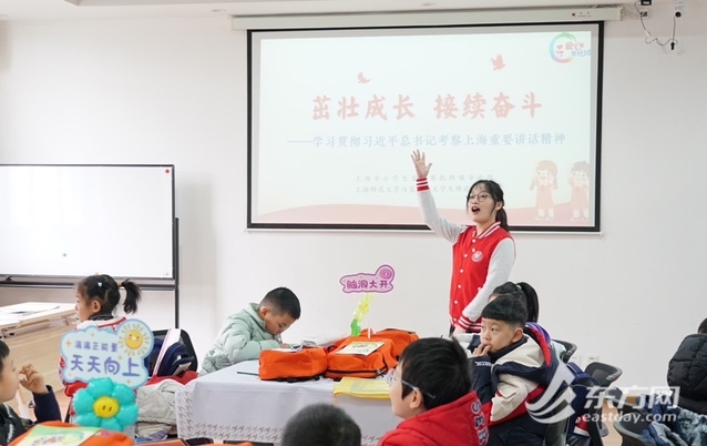 据介绍,上海师范大学马克思主义学生理论宣讲团为2024年上海市爱心寒托班设计开发了开班第一课,用鲜活灵动易懂的方式、小学生可以理解的语言和故事让孩子们了解国事民情,将我国大飞机事业的发展、中国共产党的初心、中国国际进口博览会的举办、人民城市的建设等内容讲明白、讲深刻、讲生动,激励孩子们从小坚定理想信念、树立远大理想、勤奋学习、刻苦钻研,未来努力成为堪当民族复兴重任的时代新人。