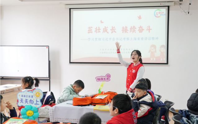 “如何将习近平总书记考察上海重要讲话精神转化成为小学生可以理解的语言和故事,引导学生读懂总书记对上海的殷切嘱托,激发学生对于祖国未来建设的责任感?”围绕着这个问题,上海师范大学马克思主义学生理论宣讲团为2024年上海市爱心寒托班设计开发了开班第一课,用鲜活灵动易懂的方式,带领寒托班的孩子们学习习近平总书记六次考察上海的重要讲话精神,将习近平总书记密切关注的国事民情,包括我国大飞机事业的发展、中国共产党的初心、中国国际进口博览会的举办、全过程人民民主的实践、人民城市的建设以及科技创新等讲明白、讲深刻、讲生动,激励孩子们从小坚定理想信念、树立远大理想、勤奋学习、刻苦钻研,努力成为未来堪当民族复兴重任的时代新人。