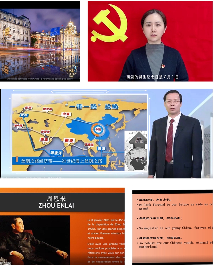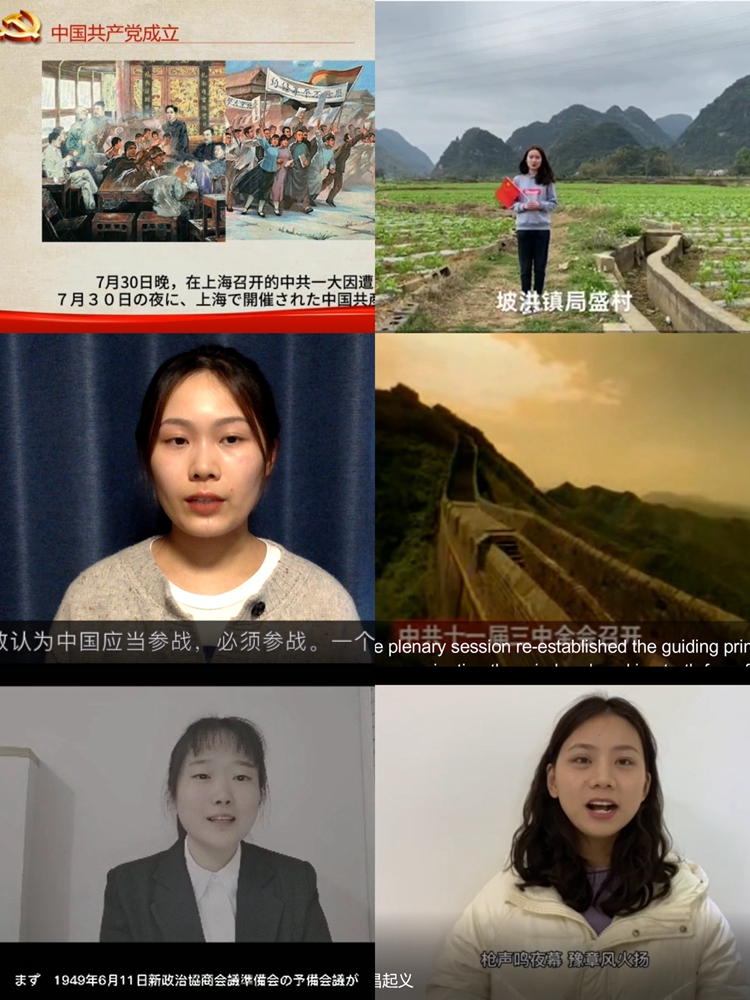 以讲好红色故事传承红色基因,为了重温中国共产党带领全国各族人民“站起来、富起来、强起来”的奋斗历程与取得的辉煌成就,外国语学院大外第一党支部的原苏荣、赵飞老师用英语讲述了主题为《奋进新时代》的党课;大外第二党支部书记陈赢老师用生动图片展示《滨江故事》;英语党支部书记宋梅砚老师用中英文分享《少年中国说》;日语及多语种党支部的阮洁卿老师用法语讲述了《周恩来和法国》;行政党支部书记王涓老师在党旗下讲述了《中国共产党诞生纪念日》。本研学生党支部则开展了形式多样的党课,有的在广西支教当地开展了田野党课、有的讲述中国共产党成立的历史党课、有的则用视频开展电影党课。外国语学院100名师生党员以多语种的形式围绕“日出东方、当家作主、砥砺前行、中国梦”四个关键词分别讲述中国共产党成立、新中国成立、改革开放和奋进新时代的党的故事,在坚守初心使命的同时永葆生机与活力。