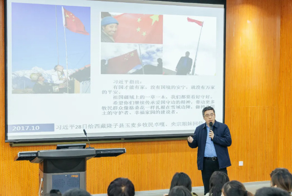 课堂上,援疆又援藏的李劲、80后“上海阿爸”傅欣结合自身经历,生动讲述了克服生活上种种困难投身教育精准扶贫的故事。70后李劲作为第五批援疆干部,在新疆阿克苏教育学院任职期间,创办当地第一份汉文版教育类综合期刊。援疆结束后,又担任西藏日喀则市上海实验学校校长。朴实的李劲老师并没有讲他援藏援疆中遇到的种种困难,“缺氧不缺精神”体现在他推动办学质量、培养学生的每一个具体行动中。他动容地讲道,那里的孩子特别淳朴、特别渴望高质量的教育,学生的健康成长是他最大的教育幸福。他娓娓道来,作为上海市共康中学党总支书记、校长,为国家培养少数民族学生的生动故事。与西藏、新疆少数民族学生的情谊,已经融入他的生命中。