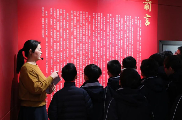 “大家注意看这篇‘前言’,你们知道《岳阳楼记》吗?”在校史馆进门处,学生就被讲解员的提问吸引,“这篇前言就是仿照《岳阳楼记》的格式所写,大家可以试着读一读,朗朗上口。”