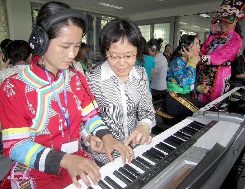 本报讯2011年5月13日,一位来自云南普洱市希望小学的音乐教师在上师大音乐学院宗励老师指导下弹起电子钢琴。