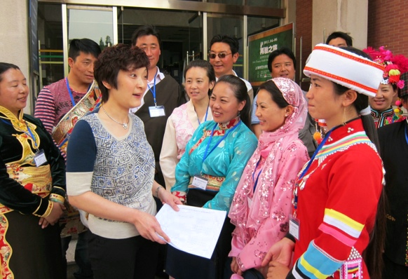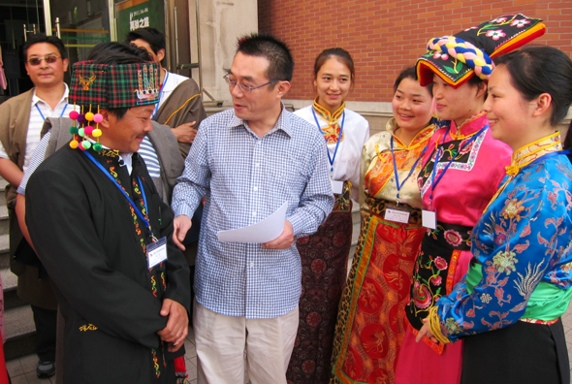 上海师范大学音乐学院副院长田晔与来自四川、云南等省的农村小学音乐教师交谈。