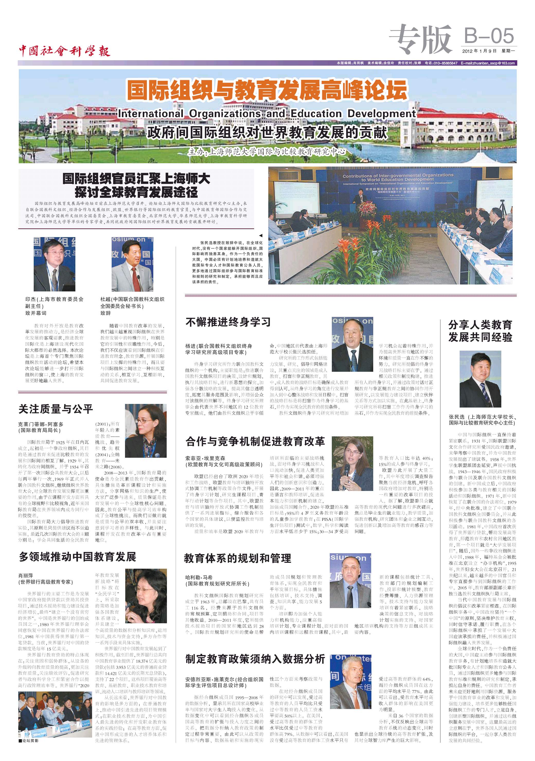 国际组织与教育发展高峰论坛日前在我校召开,《中国社会科学报》2012年1月9号(第252期) 对此进行了专版报道,全文转载如下: