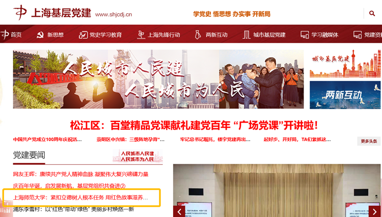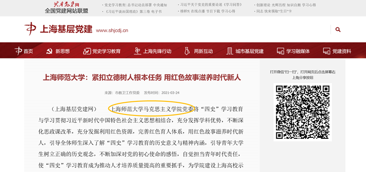 近日,上海基层党建网以“上海师范大学:紧扣立德树人根本任务 用红色故事滋养时代新人”为题,首页专题报道了上海师范大学马克思主义学院党委开展“四史”学习教育的系列活动以及学习成效。