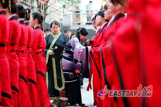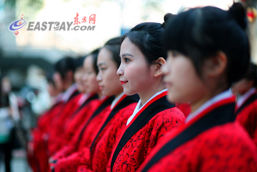 东方网记者刘歆3月29日摄影报道:日前,来自上海师范大学女子学院的百余名汉服少女亮相四川北路商业街。她们身着红色汉服,气质优雅,翩翩起舞,吸引了众多市民的眼球。据悉,这是2012上海东方女儿节的活动之一。
