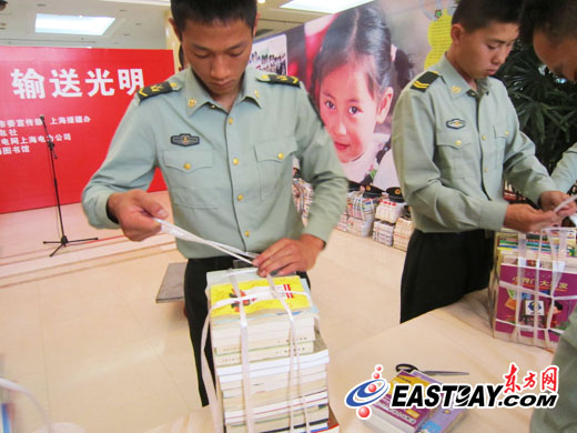 捐赠活动上,来自“南京路上好八连”的指战员、上海师范大学的学生们,不辞辛苦东方网5月6日消息:的担任志愿者,在现场分拣、捆扎图书。