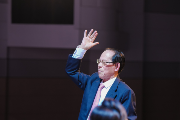 今年是小提琴协奏曲《梁祝》首演65周年,作为本场音乐会的压轴曲目,何占豪亲自指挥玉兰筝团演奏筝独奏与筝乐队协奏的《梁山伯与祝英台》。在上师大音乐学院民乐系主任、古筝演奏家宋小璐副教授与青年古筝演奏家陈蓓萱的领奏下,耳熟能详的优美旋律再度浸润听众心灵,把音乐会推向高潮。