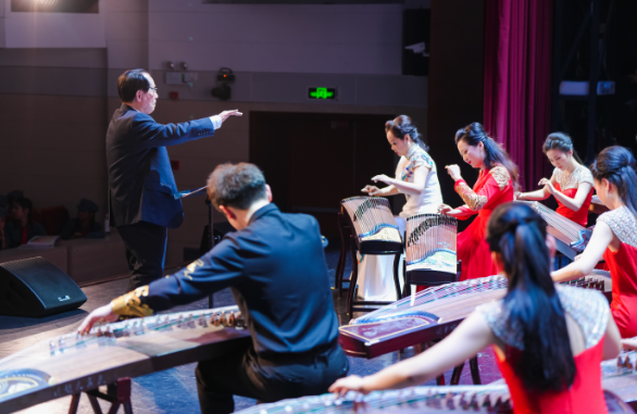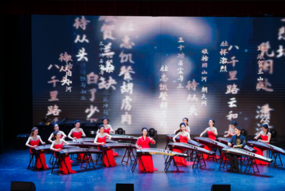 青年古筝演奏家陈蓓萱领奏,上师大玉兰筝团协奏的筝重奏《临安遗恨》由何占豪改编于2004年。乐曲以古曲《满江红》音调为核心素材,表达民族英雄岳飞壮怀激烈的报国之情。
