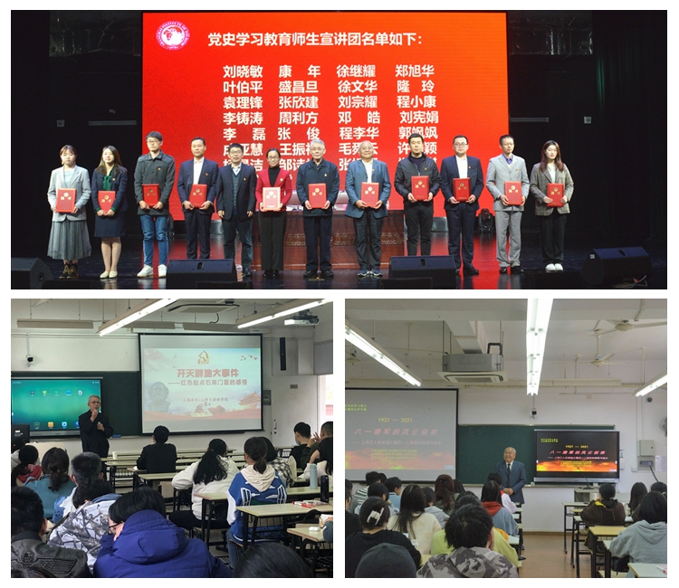 成立学院宣讲团,全面启动宣讲活动。举行学院党史学习教育师生宣讲团成立仪式。宣讲团成员由学院领导、退休老同志、校友、思政专兼职教师及学生骨干等组成。他们将以习近平总书记关于党的历史的重要论述为根本遵循,全面准确讲清中国共产党百年奋斗的光辉历程,坚持马克思主义历史观,把学习贯彻党的创新理论摆在突出位置,引导师生、群众树立正确的历史观,通过多种形式互动交流,增强宣讲感染力和吸引力,让宣讲接地气、冒热气、聚人气,高标准高质量做好宣讲工作。成立仪式当天,两位宣讲团成员、退休老同志叶伯平、盛昌旦分别以《红色起点树德里》《八一建军的风云前奏》为题,在学生群体中开展党史宣讲,引导学生认真学习党史,培养历史思维,从历史中汲取奋斗力量,肩负起时代重任,争做担当民族复兴大任的时代新人。