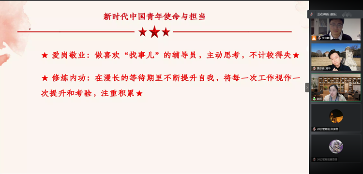 青年是国家和民族的希望。为迎接建党100周年,庆祝五四青年节的到来,4月15日晚,教育学院邀请到清华大学终身教育处国际合作高级主管兼世界慕课联盟助理秘书长、教育部在线教育研究中心助理研究员黄尔诺老师与教育学院公共事业管理(师范)专业学生、国际与比较教育研究院研究生,通过线上分享的形式,共同探讨“新时代中国青年的责任与担当”。国际与比较教育研究院张华峰博士担任主持,学院党委副书记、副院长赵乐,公共事业管理(师范)专业负责人张继龙,专业教师胡仲勋、梁茜,辅导员熊王美出席活动并参与分享。