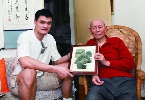 图片说明:李震中老人与姚明合影。资料照片