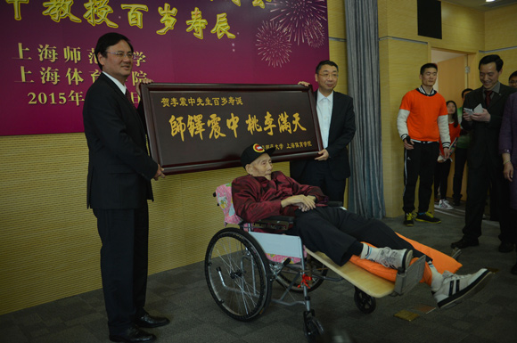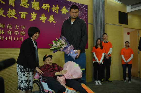 图片说明:2015年,李震中百岁寿辰庆祝会,姚明等百人到场祝贺。