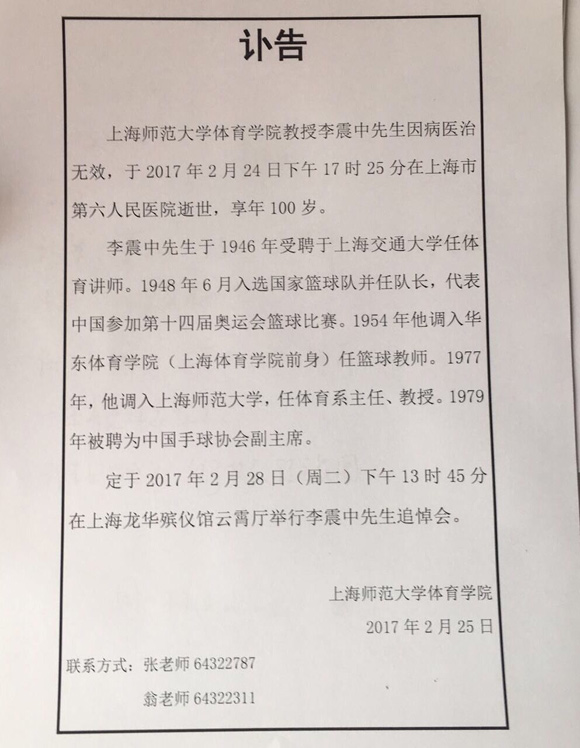 东方网记者刘辉2月25日报道:今天,上海师范大学发布讣告称,该校体育学院教授、中国篮坛泰斗李震中昨天下午在沪逝世,享年100岁。