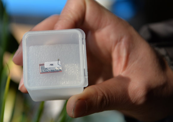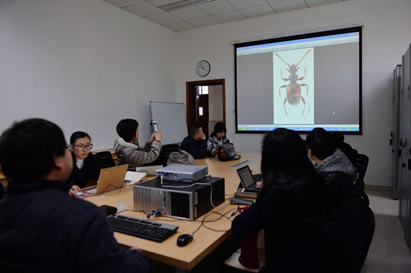 图片说明:上海师范大学昆虫研究室的工作人员正在介绍“西郊公园毛角蚁甲”。