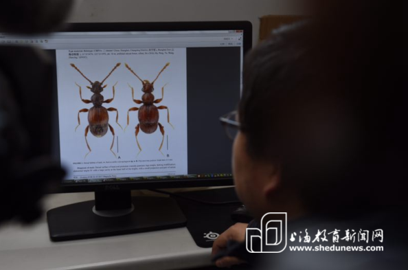 课题开展2年多来,课题组成员定期定点开展采样,甚至经常利用工作之余的休息时间,采集了大量的昆虫样本,已经鉴定出的种类超过了270种。在去年夏天的一次野外取样中,一种特殊的小甲虫引起课题组成员的注意,这种甲虫的头部和前胸部有明显的粗褐点。经过文献资料查阅和标本解剖的比对,最终由殷子为鉴定为新物种,这也是在上海地域首次发现蚁甲新物种。