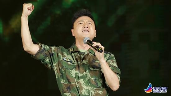 图片说明:在文艺晚会现场,殷为杰为鼓舞部队士气倾情演唱