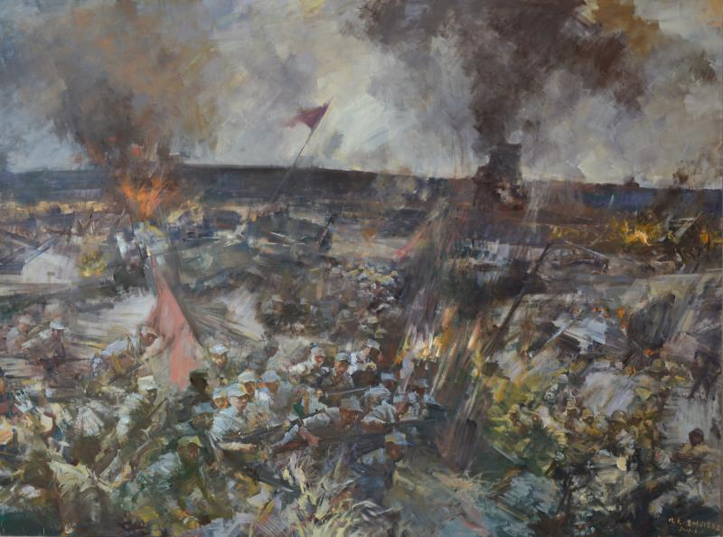 这两件作品是军事博物馆于2016年年底向我校“海上绘画名家工作室”定制的。工作室负责人,我校美术学院院长俞晓夫教授接到创作任务后,积极组织工作室的精兵强将论证构思,亲自带领团队成员深入生活,到战役发生地实地采风收集第一手创作资料,先后创作出多幅草图小稿,不断推敲打磨,精益求精,力求在还原历史事实及艺术感染力两个方面做到有机统一。进入正式上大画阶段,俞晓夫教授更是以饱满的创作激情投入到创作中去,过程中无论是在形象的创造性选择,还是对大局的概括把控上经常会有神来之笔,令人拍案叫绝。